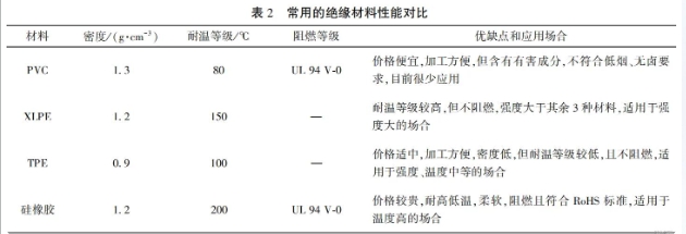 電動(dòng)汽車內(nèi)部環(huán)境復(fù)雜,在選用絕緣材料時(shí),一方面要保障好絕緣層的安全使用,另一方面盡可能選擇易加工和使用廣泛的材料。目前常用的絕緣材料有聚氯乙烯(PVC)、交聯(lián)聚乙烯(XLPE)、硅橡膠、熱塑性彈性體(TPE)等,其主要性能見表2。